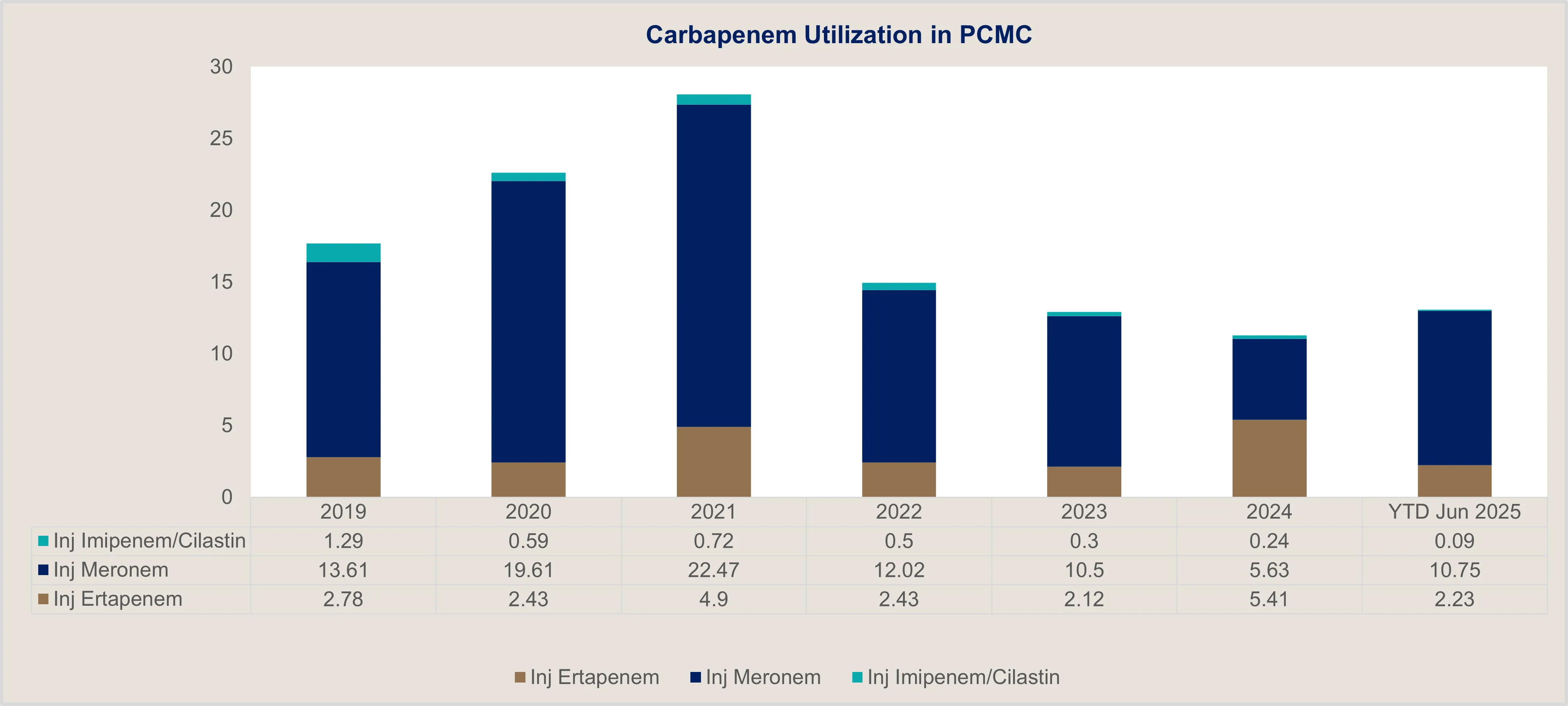 At Prince Court Medical Centre, carbapenem usage has shown a notable downward trend, particularly between 2023 and 2024, where overall usage reached 13%. This decline underscores the effectiveness of the Antimicrobial Stewardship (AMS) program, which emphasizes judicious and targeted antibiotic use rather than blanket reductions. By fostering responsible prescribing practices, the AMS initiative plays a critical role in mitigating antimicrobial resistance and ensuring safe, high-quality care and optimal outcomes for patients.
