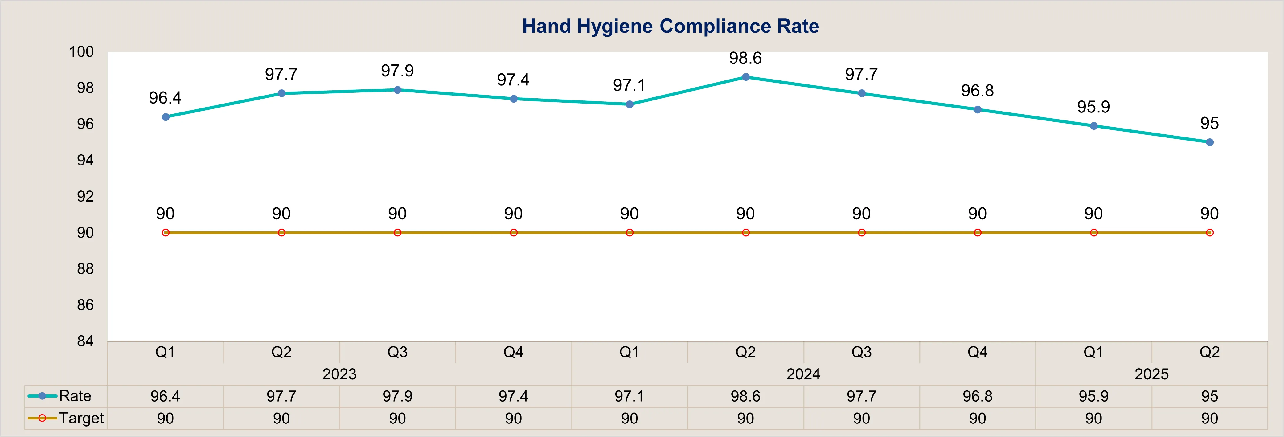 Prince Court consistently exceeds 95% compliance with hand hygiene standards.